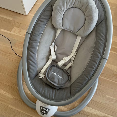 Babygynge med elektrisk vuggefunksjon i svart sete med grå ramme. Setet har polstret innlegg og justerbare seler for å holde barnet på plass. Gyngefunksjonen styres fra panelet foran på basen. Over setet er det en bøyle med myk leke som kan tas av eller justeres. Passer til spedbarn og små barn innenfor anbefalt vekt- og aldersgrense fra produsent. Egner seg til bruk innendørs på jevnt underlag.