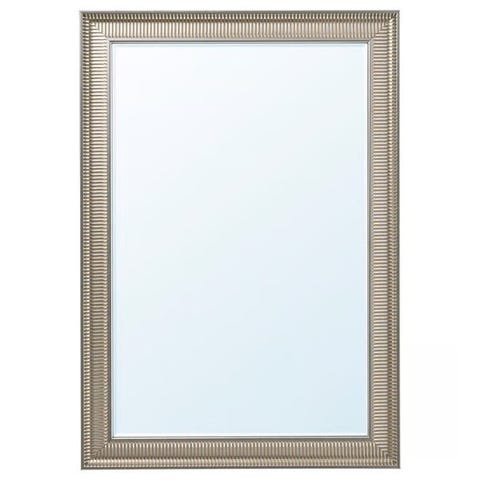 IKEA rektangulært speil med bred, profilert ramme i sølvfarge. Speilet har dekorativ kant med små kuler langs innsiden av rammen. Passer til veggmontering i stue, gang eller soverom.