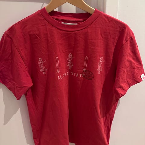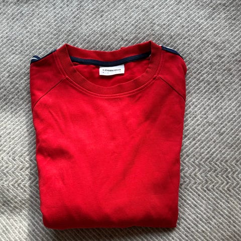Sunspel genser for herre i størrelse M. Genseren er rød og laget av bomull. Klassisk rund hals og lange ermer, egnet til hverdagsbruk eller som et ekstra lag på kjølige dager.