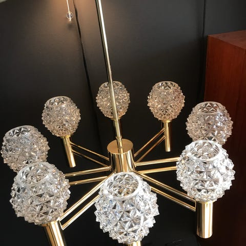 Seksarmet lysekrone i messing, med el/lyspærefester.