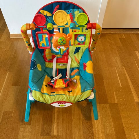 Fisher-Price vippestol med vibrasjon, lyd/musikk og lys som kan tas av/på.