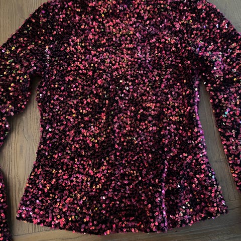 Denne paljettjakken har metalliske sløyfeknapper og en rund hals. Lange ermer.Jakken har en normal passform.