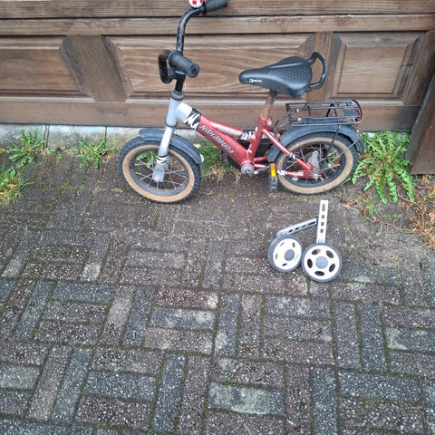 Barnesykkel 12" med støttehjul, pedaler med kjedebeskyttelse og refleks i hjulene. Egnet til bruk på asfalt og jevnt underlag.