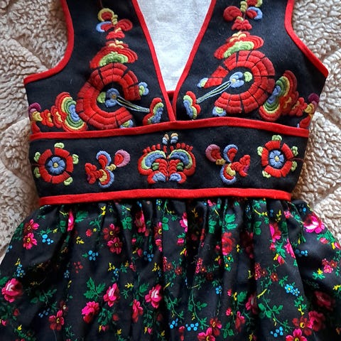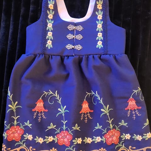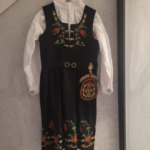 Løken barnebunad som kan justeres over flere år ut i fra lengden på barnet. Eier har brukt den fra alder 3 til 10, men heter seg str 6 til 12. Komplett ( uten skjorte og søljer)