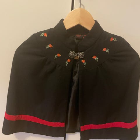 Cubus cape for jente i størrelse 140. Capen er blå og laget i bomull. Den har broderte detaljer og lukkes med en sølvfarget hekte foran. Passer som ytterplagg eller over kjole og annet tøy i kjøligere vær.