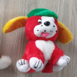 Bamse kosedyr kanin i gul farge. Mykt plysjleketøy med hvit mage og kinn, røde detaljer og blått mønsterstoff på ører og tilbehør. Egnet som kosedyr for barn eller som pynt på barnerom.
