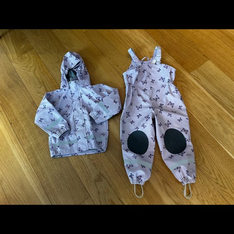 Lilla reflex regntøy i str 104. Mangler knapp for fotstrikk på ene beinet.