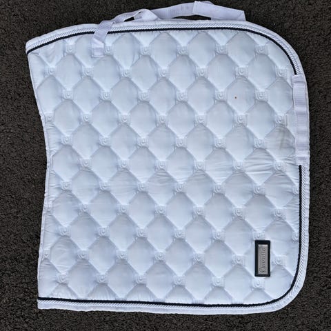 Horze dressursjabrak i størrelse Full/DR. Sjabraken er hvit med rutet quilting. Ytterstoff, fôr og polstring er laget av 100 % polyester. Utstyrt med stropper for feste til salen. Egner seg til bruk under dressursal for å gi jevn trykkfordeling og beskytte hestens rygg og salen. Brukt to ganger.