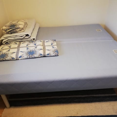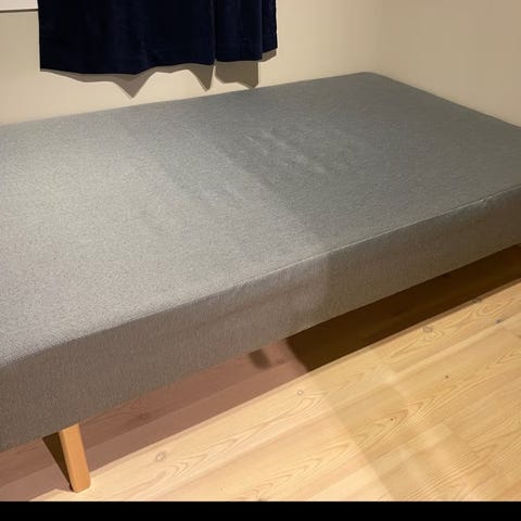 IKEA seng med madrass i grått trekk. Sengen har ribbebunn i tre og en enkel, rett utforming. Madrassen har et avtagbart overmadrass-lignende lag på toppen i samme grå farge. Passer som enkeltseng på soverom, gjesterom eller hybel. Egnet for én person. Størrelse 200 x 90cm