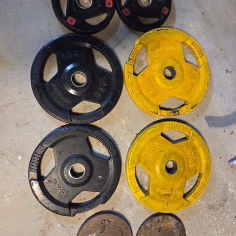 Vektstang med vektskiver selges.