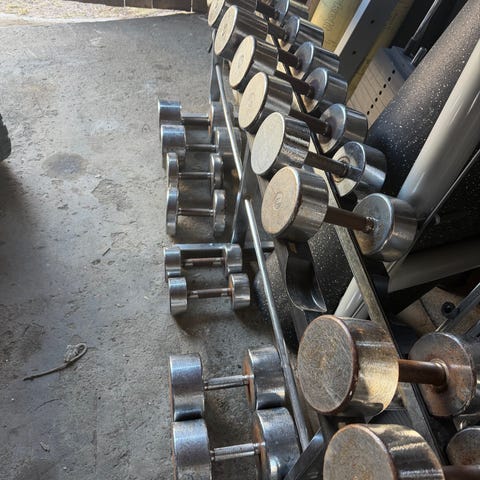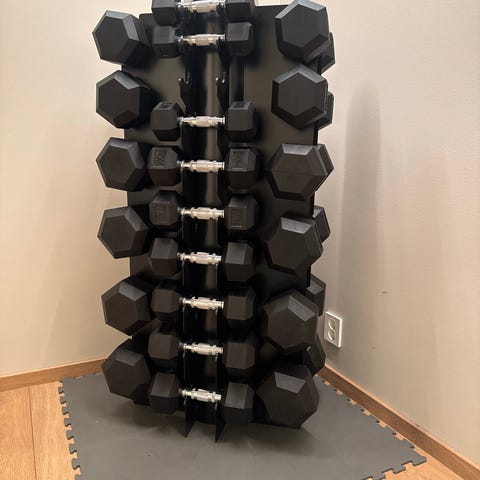 Manualsett med stativ bestående av flere par sekskantede manualer i ulike vekter. Manualene har gummibelagte hoder og metallgrep, noe som gir et stabilt og slitesterkt treningsutstyr. Stativet har flere hyller som holder manualene organisert og lett tilgjengelige.