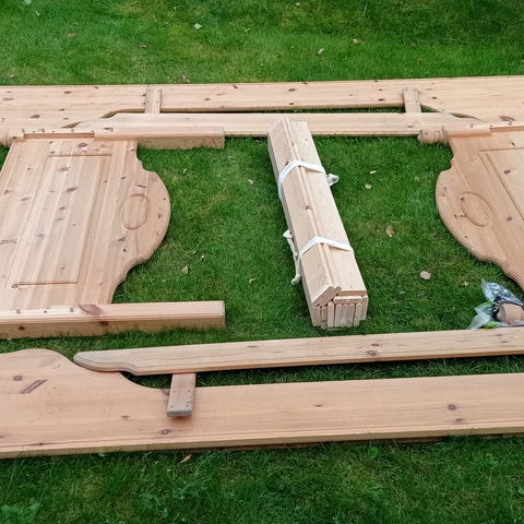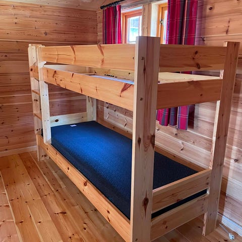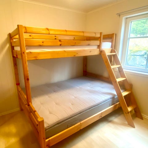 Køyeseng i lakkert furu. Overkøya kan løftes av slik at det blir to enkeltsenger. Madrasser følger ikke med.
