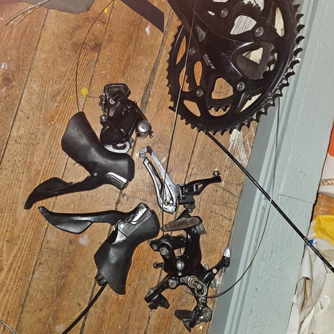 Shimano 105 sykkelgruppe for landeveissykkel. Mekanisk (ikke Di2). Tatt av ny CUBE sykkel. Selges kun delene som vises på bilder.