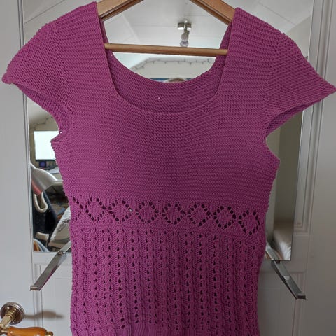 T-shirt, str m, farge rosa, garn: allpakka, over vidde: 47cm, hel lengde: 57cm! 800,-