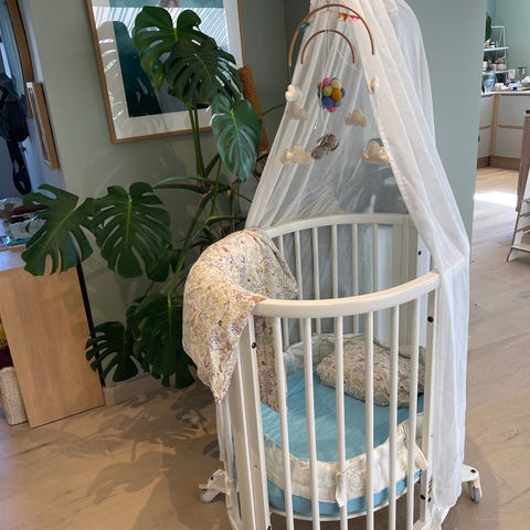 Stokke sleepi - mini og sleepi seng. Den selges med begge madrasser og kan selges med dyne x2 og pute, hvis ønskelig. Flettekanten kan kjøpes for 400kr i tillegg.
