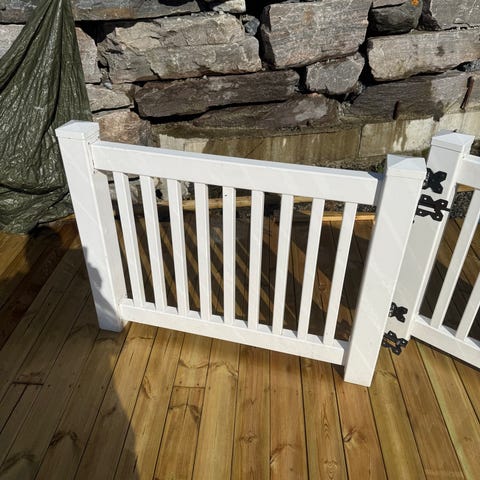 Port i metall med tilhørende stolper i svart utførelse. Består av en rektangulær portseksjon med vertikale sprosser og to solide stolper med festebeslag for montering. Egnet som innkjøringsport eller hageport der det er behov for en mekanisk åpne- og lukkefunksjon. Kan tilpasses eksisterende gjerde eller rekkverk etter behov. Mål er 160 bredde 90 cm høyde
