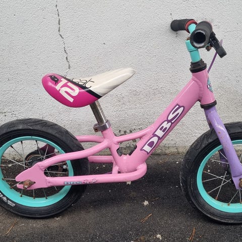 Løpesykkel for barn med 12" hjul. Sykkelen har blå ramme, samt sete med bærehåndtak bak. Egnet for mindre barn som skal øve balanse og koordinasjon.