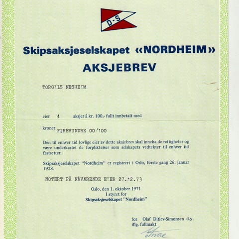 Aksjebrev : Nobø Fabrikker AS papirsertifikat