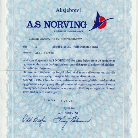 Nobø Fabrikker AS aksjebrev papirsertifikat. Aksjebrevet er trykt på dekorert papir med norsk og engelsk tekst, inkludert pålydende beløp i NOK og signaturfelt. Sertifikatet kan egne seg som dokumentasjon, samlerobjekt eller dekorativt innslag, avhengig av kjøpers behov og formål.
