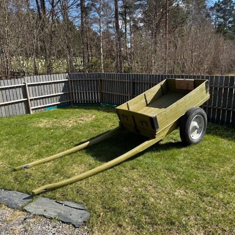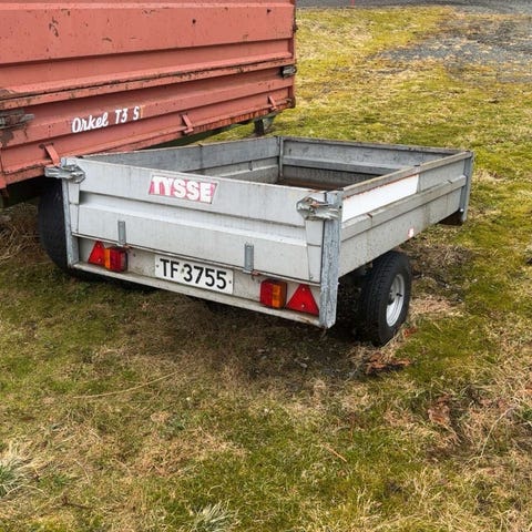 Denne er no holdt av til lørdag 28.3. 1995 modell tysse henger med maksvekt 750 kg selges. Denne har i hovedsak blitt brukt til hageavfall etter atv i mitt eie og funker fint til det. Lys fungerte fint sist jeg sjekket, følger med et ekstra sett med dekk. Litt klunkelyder ved kjøring på vei så mulig noe må strammmes opp under. Men fungert fint til mitt bruk. Selges da jeg allerede har en større henger og denne blir lite brukt.