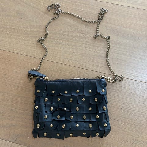 Skulderveske i lær for dame. Vesken er svart med dekorative stjernedetaljer på utsiden, i sølv, grå og svart.