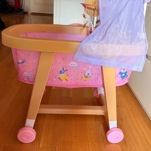 Flott dukkeseng i tre og dukke fra ca 1950-tallet. Katteseng? Hundeseng?