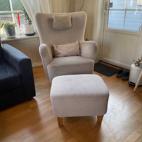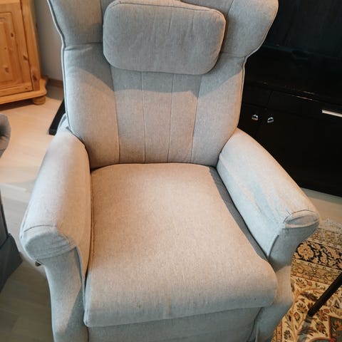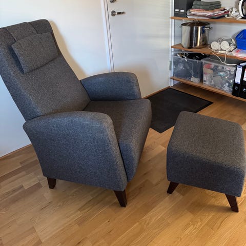 Gir bort en grå lenestol. Kjøpte den brukt på brukom i Trondheim, men den blir dessverre for lite brukt hos oss. Den har noen merker fra katt, men ikke veldig mye.