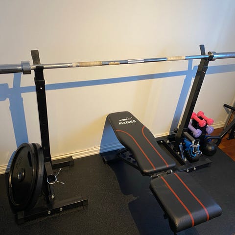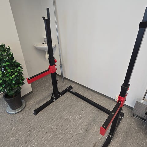 Vektstativ med vektstang og vektskiver i rød/svart utførelse. Stativet har justerbare høyder for vektstangen, som gjør det egnet til øvelser som benkpress og knebøy. Bunnrammen er bred for økt stabilitet, og konstruksjonen er i metall med plast-/gummidetaljer på føtter og holdere. Vektstangen er rett og tilpasset bruk med løse vektskiver. Utstyret passer til hjemmegym eller mindre treningsrom for styrketrening med frivekter.