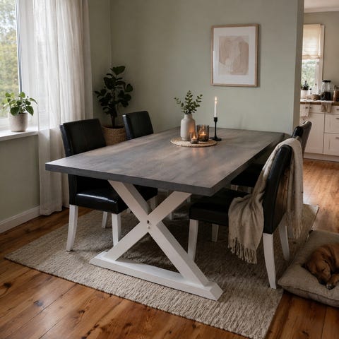 Fint hvitt spisebord selges med lengde 180cm uten ileggsplate og 225 cm med ileggsplate.