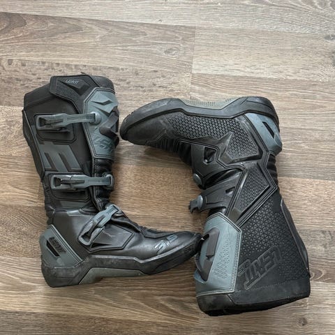TCX motorsykkelstøvler i svart skinn i størrelse 41. Støvlene har høy skaftlengde med forsterkninger rundt ankel, hæl og legg, samt girskifteforsterkning over vristen. Lukkes med glidelås og borrelås på innsiden av leggen. Fine og komfortable sko til både rolig og sportslig kjøring på veien!