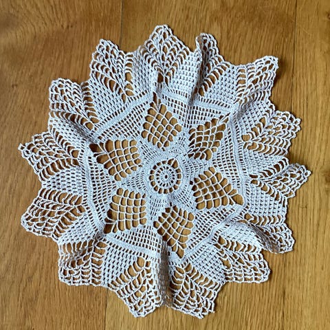 HÅNDARBEID- 1 meget flott rund brikke, er 25 cm og HEKLET i litt grovere garn (ikke så mye), veier 20 gram. Fargen er lys beige/sandfarget. Fremstår som meget fin! Som ny. Brikken er nyvasket. Har et spesielt mønster, med senter og «striper» utover. Se alle bildene! Brikken kan sendes, eller hentes her i Sandefjord.