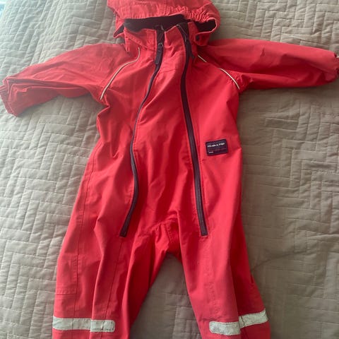 Polarn O. Pyret parkdress for barn i størrelse 92. Dressen er svart og laget i polyester. Modellen er unisex og har lange ermer og ben. Den har glidelås foran, refleksdetaljer på ben og armer samt hette. Innsiden har mesh-fôr øverst og navnelapp. Egnet som overgangsdress.