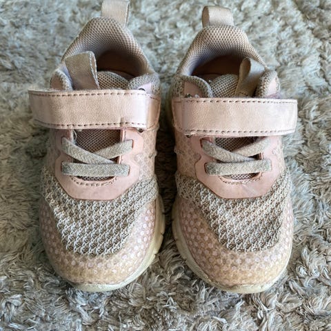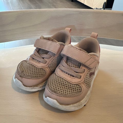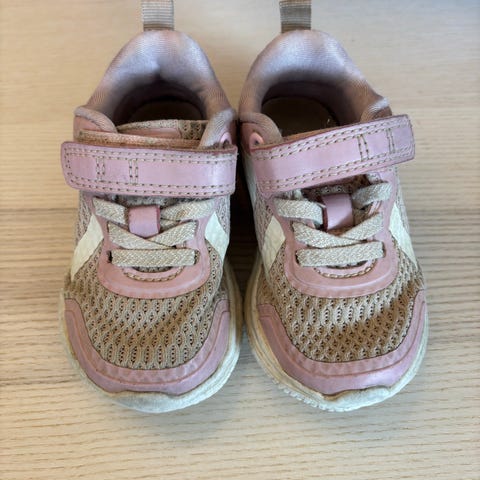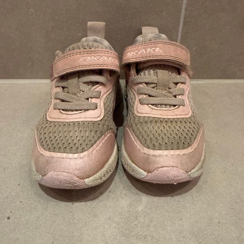 Okaki joggesko i rosa farge. Noe slitasje på tuppen, men ingen hull. Lette og gode å løpe i for barneføtter.