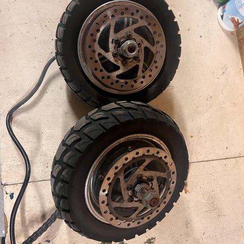 Selger mine lovlige ubrukte E7 motorer da de ble byttet ut med ulovlige med en gan jeg fikk el sparkesykkelen. Dekkene ble tatt av og satt på de ulovlige. ene motoren mangler også ventil, men det får man kjøpt på ewheels for en hundre lapp. selges helst samlet, men kan selge separat.