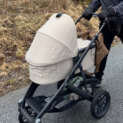 Følger med oppbevaringspose og stropper som kan brukes til å feste sengen i foreldresengen.