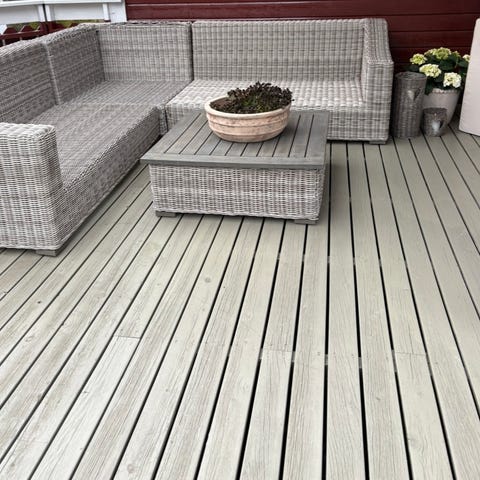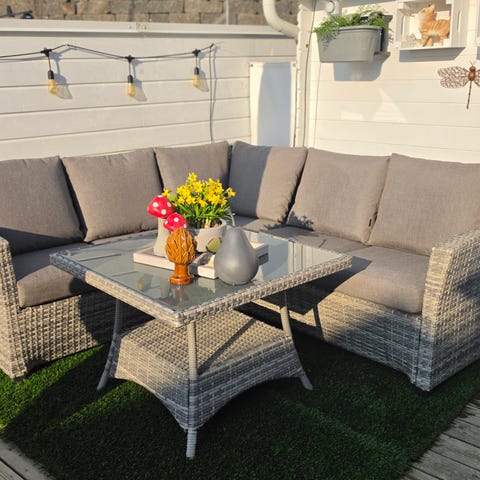Hjørnesofa og bord utemøbler i kombinasjon av grått tekstil og treverk. Sofaen har vinkelutforming med puter i grått stoff. Bordet har rektangulær bordplate i glass.