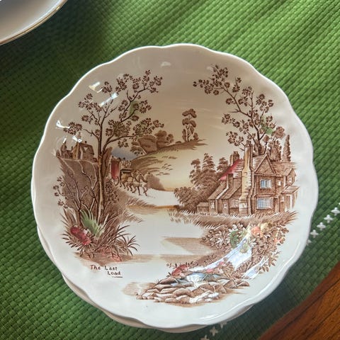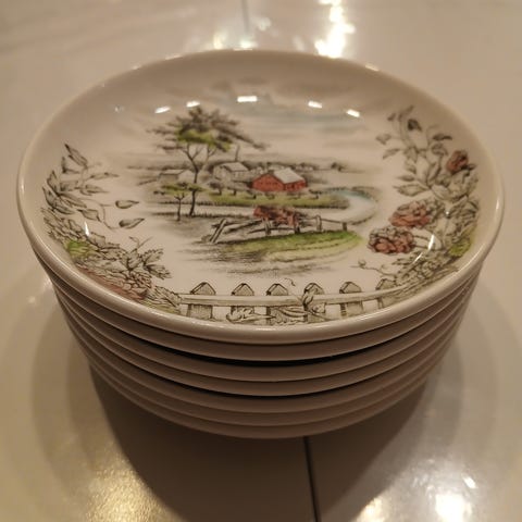 Åtte stk firkantede frokost tallerkner. Hele og fine i glasuren. Et lite hakk i den ene. Fra det engelske serviset spring. Johnson bros.