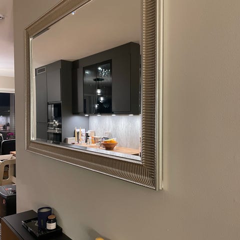 IKEA Songe speil med rektangulær form. Speilet har en bred, sølvfarget ramme med dekorativ profil. Kan brukes både stående og liggende, for eksempel i gang, stue eller soverom. Egnet som veggspeil eller som stort gulvspeil lent mot vegg, avhengig av montering og plassering.