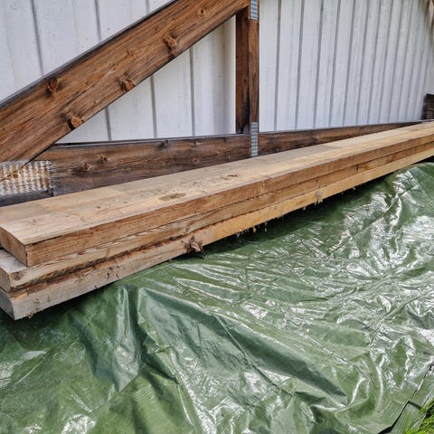 Gran materialer i store dimensjoner selges samlet. Er blitt til ivers fra et tidligere prosjekt. Er skjært på båndsag i fjor sommer, ligget til tørk siden det. Burde nok tørke lenger hvis det ikke skal brukes til noe grovt/utebenker eller lignende. Lengde er ca 4m og dim på stokken var 40cm. De er skjært på ca 7cm tykkelse. Selges samlet alle fire 1000kr, da de bare ligger og tar plass. Må hentes, Steinsholt vestfold.