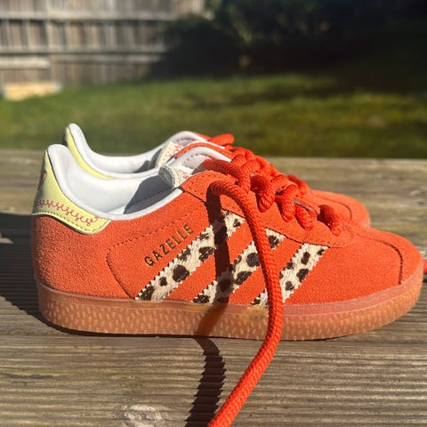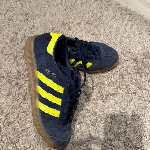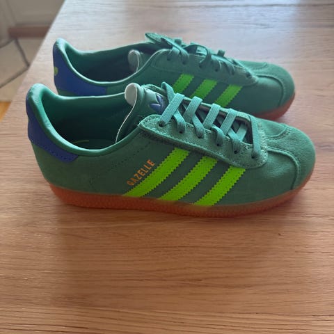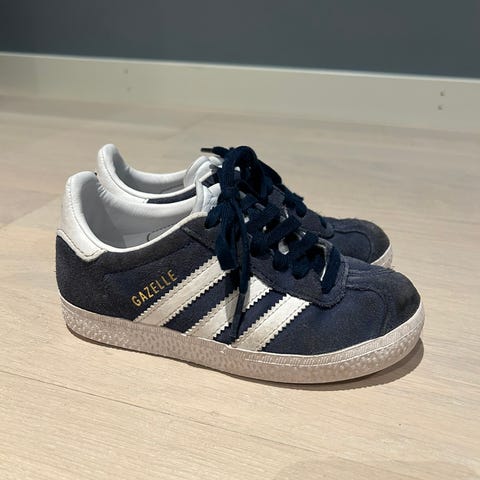 Adidas Gazelle joggesko for barn/unisex i størrelse 29. Skoene har mørk blå overdel med gule Adidas-striper og lys blå hælkappe. Yttersålen er i gummi med mønster for grep. Modellen er lav og snøres med lisser. Egnet til hverdagsbruk og lett aktivitet for barn.