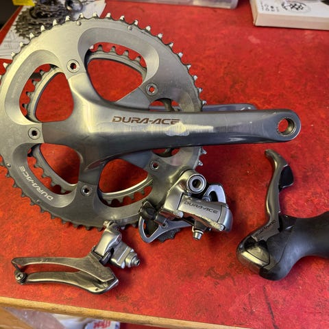 Shimano Ultegra (nesten) komplett gruppe. Mekanisk med felgbrems. Fremgiret er "clamp on". Bakgiret har blitt byttet ut med 105 R7000. Ingen kassett. Denne gruppa har sittet på.en gammel sykkel jeg ikke har brukt på en stund. Tok det endelig av og håper noen andre kan ha nytte av det. Det er ikke skadet utover det man kan forvente av bruksmerker.
