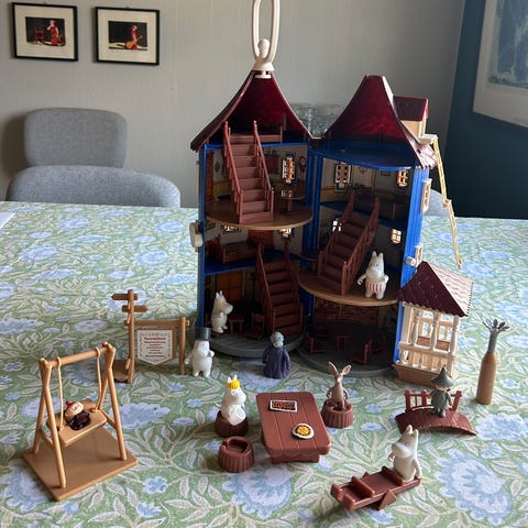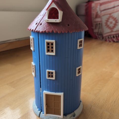 Mummihuset med flere etasjer og åpne vegger som kan brettes ut. Inneholder ulike små møbler og tilbehør som bord, stoler, trapper, seng og andre innredningsdeler. Stige er knukket og kan ikke henge i vinduet