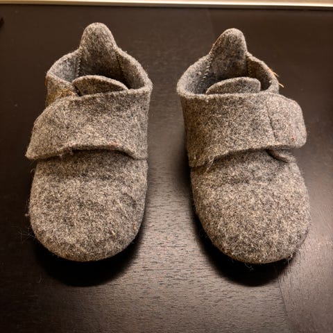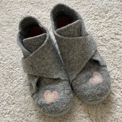 Ull sko for jente i størrelse 25. Skoene er laget i ullfilt i grå melert farge, med borrelåslukking over vristen for enkel av- og påkledning. Sålen er i gummi med mønster for bedre grep. På tåpartiet er det små hjerter som detalj. Egnet som innesko eller lette utesko i kjøligere vær.
