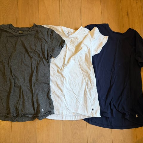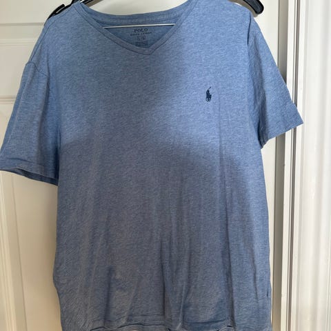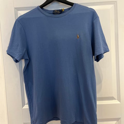Ralph Lauren Polo T-skjorte for herre i størrelse L. T-skjortene er i bomull og kommer i flere farger, med klassisk rund hals og kort erm. Diskret Polo-logo på brystet. Passer til hverdagsbruk alene eller under genser og jakke.