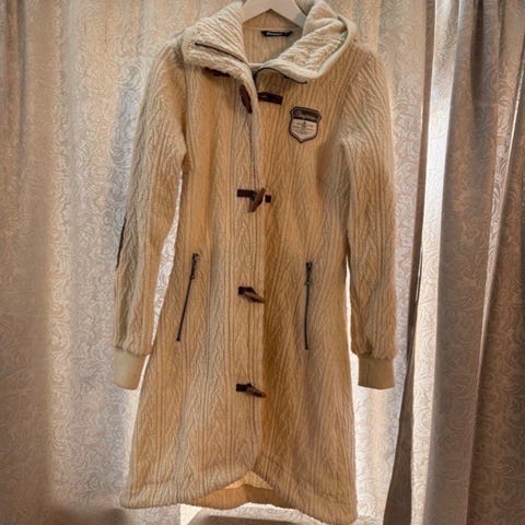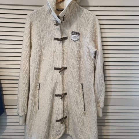 Bergans Bergfrue Lady Coat kåpe for dame i størrelse M. Kåpen er kremhvit og laget i ullblanding (ifølge vaskelapp 63 % ull, 24 % polyester, 13 % polyamid). Modellen er knelang med hette, glidelås og treknapper i front. Den har to sidelommer med glidelås og kontrastfelt på albuene. Passer som ytterkåpe i kjøligere vær.