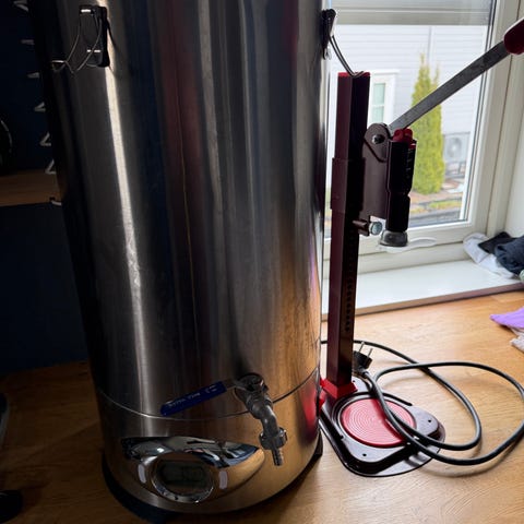 Kjøpte et brukt hjemmebryggerapparat og fikk med denne digre vannkokeren som jeg ikke trenger. Det står ingen stedet hverken på selve vannkokeren, esken eller i manualen hvor stor den er men jeg tipper den er på ca 20. liter. Kan være veldig hendig hvis man brygger øl og trenger å varme store mengder skyllevann, men for min egen del er det like praktisk å bare bruke en stor kjele.