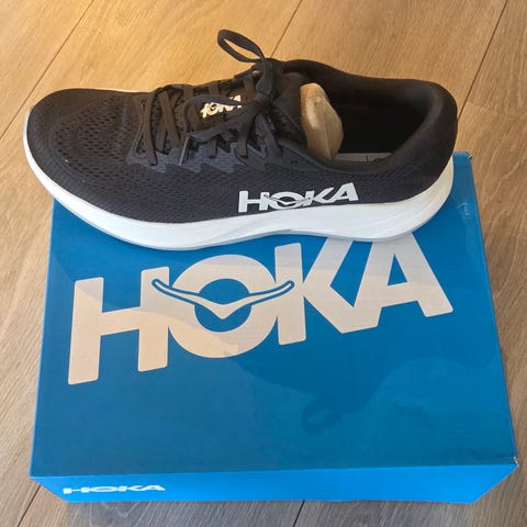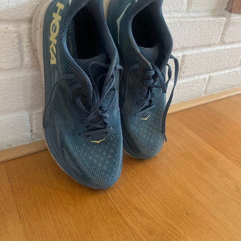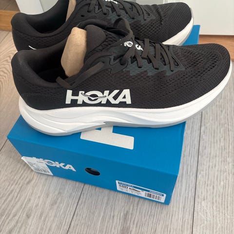 Hoka løpesko i størrelse 44. Skoen har brun overdel med oransje detaljer og kraftig oransje yttersåle med grove knotter som gir godt grep. Egnet til løping, særlig på variert underlag og sti. Overdelen er i syntetisk materiale og mesh for ventilasjon, med snøring for justerbar passform.