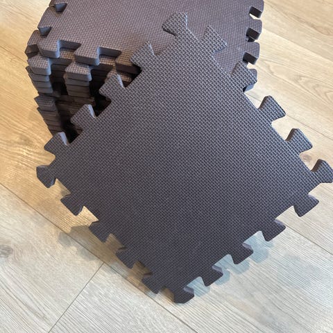 Matten er laget av tykt skum, som både demper lyd og isolerer mot kalde gulv.