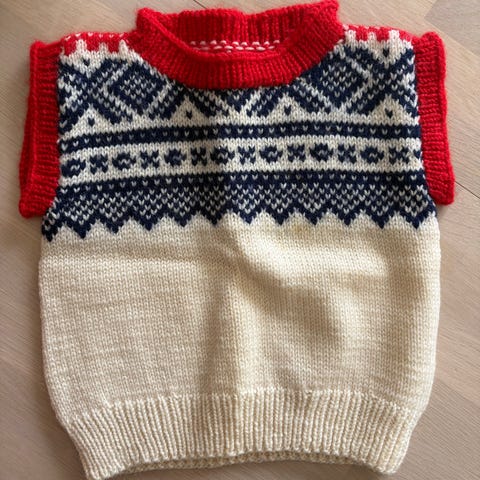 Fin hjemmestrikket vest i ull. Marius mønster. Passer til ca 2 åring. Se bilder for mål.