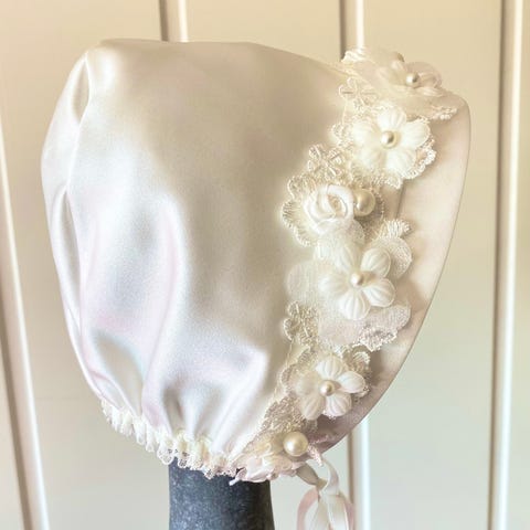 Selger et sett til første nattverd: hårkrans, hansker og liten veske.